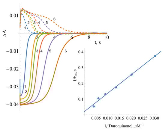 The kinetics of BsFNR (5 µM) reduction and reoxidation under multiple turnover conditions with a varying concentration of duroquinone in the presence of 50 µM of NADPH followed at 460 nm (solid curves) and 600 nm (dashed curves): 1—250 µM of duroquinone, 2—166 µM of duroquinone, 3—111 µM of duroquinone, 4—74 µM of duroquinone, 5—49 µM of duroquinone, and 6—33 µM of duroquinone (all concentrations were reported after mixing). The inset shows the Lineweaver—Burk plot for the dependence of the apparent first-order rate constant of the reoxidation of reduced FAD on the concentration of duroquinone.