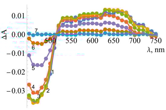 The spectra of reaction intermediates formed during the turnover of 5 µM of BsFNR in the presence of 50 µM of NADPH and 250 µM of duroquinone (concentrations were reported after mixing). Differences in absorbance are shown at several timepoints over the 450–750 nm range. Spectra correspond to 50 ms (1, blue), 100 ms (2, orange), 250 ms (3, green), 500 ms (4, red), 750 ms (5, purple), 1 s (6, brown), and 5 s (7, teal) after mixing.