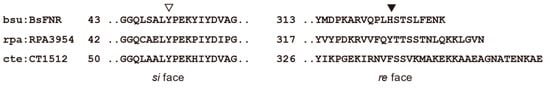 The partially aligned amino acid sequences of BsFNR, R. palustris FNR (RPA3954) and Chlorobaculum tepidum FNR (CT1512). The residues stacked on the si-face (Tyr50 in BsFNR) and re-face (His324 in BsFNR) of the isoalloxazine ring portion are indicated with arrowheads. The alignment was performed using ClustalW [].