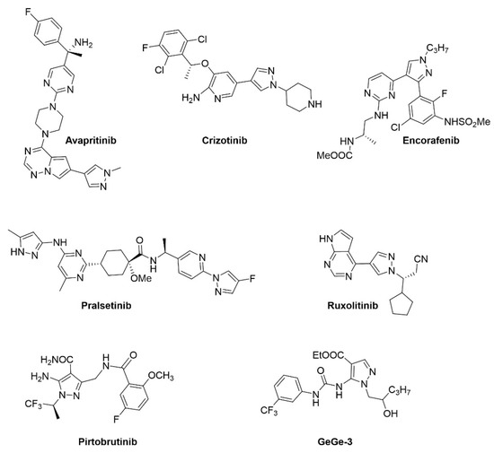 Pyrazoles are molecules characterised by a 5-membered heterocycle with three carbon atoms and two adjacent nitrogen atoms. The pyrazole scaffold is very versatile and utilised in a wide range of drugs displaying a broad range of pharmacological activities, including anti-inflammatory, anticancer, anti-infective and many others [1,2,3]. One of the best-known examples of a successful pyrazole-based drug is the drug celecoxib, a nonsteroidal anti-inflammatory drug (NSAID) that selectively inhibits COX-2, used to treat pain and inflammation in a range of conditions [4]. There has also been a considerable amount of progress in developing pyrazole derivatives as potential anticancer drugs [5,6,7,8]. In the latter context, the pyrazole scaffold has proven to be especially useful for the design of protein kinase inhibitors. A significant proportion of novel, FDA (US Food and Drug Administration)-approved protein kinase inhibitors are based on pyrazole chemistry; these include avapritinib, crizotinib, encorafenib, pralsetinib, ruxolitinib, and pirtobrutinib [9]. Their structures are illustrated in Figure 1, compared to GeGe-3.
