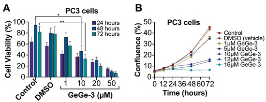 The effect of GeGe-3 on cell viability in PC3 prostate cancer cells. (A) Cells were seeded at 50,000 cells/mL and exposed to 1, 10, 20 and 50 μM GeGe-3. A trypan blue cell viability assay was performed at 24-, 48- and 72-h post-treatment. The percentage of viable cells is shown. N = 3. (B) Cell confluence was measured using the IncuCyte live cell imager over a 72-h period in PC3 cells. N = 6. Indicates significant differences (* p ≤ 0.05, ** p ≤ 0.01).