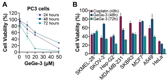 The MTT (3-(4,5-dimethyl-2-thiazolyl)-2,5-diphenyl-2H-tetrazolium bromide) assay kit was purchased from Abcam. For the MTT assay on PC3 cells (Figure 3A), cells were seeded into 96-well plate at 4000 cells/well. Cells were pre-incubated for 72 h and then treated with varying concentrations of GeGe3 (1, 10, 20 or 50 µM). After the desired time (24, 48, 72 h), culture media was removed and replaced with 50 µL serum-free media Opti-MEM and 50 µL MTT reagent in each well and cells incubated for three hours. The MTT reagent was removed and 150 µL MTT solvent was added to each well and placed on an orbital shaker for 15 min. Absorbance was measured at 590 nm using a FLUOstar OPTIMA microplate reader. The MTT assay on the wider sample of cancer cell lines (Figure 3B) was performed as follows. After an intermediate dilution in growth medium, GeGe-3 and cisplatin were added to the cultured cells at a final working concentration of 10 μM and incubated for 48 or 72 h. At the end of the incubation, 30 μL of MTT at a concentration of 2 mg/mL in PBS, were added to each well and incubated for four hours. The supernatants were removed and 100 μL/well of DMSO were added to each well to dissolve the formazan precipitates and absorbances read after 20 min. Results are expressed as a percentage of the control samples (DMSO vehicle alone). The assay was repeated three times, and a single compound was tested six times.