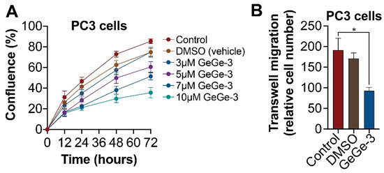 Effect of GeGe-3 on cell migration in PC3 cells. (A) IncuCyte Scratch Wound Analysis software (v2020C) was used to monitor the percentage wound closure of PC3 cells over a 72-h period following treatment with 3, 5, 7 and 10 μM GeGe-3; N = 8 replicates. (B) Trans-well cell migration assay following treatment with 20 and 50 μM GeGe-3. Relative cell numbers are shown. N = 3 repeats. * p < 0.05.
