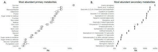 The data shown are based on six biological replicates. R version 4.3.0 (R Core Team, 2023) was applied for the analyses of primary and secondary metabolites. The _ggplot2_package [57] was used for the preparation of the boxplots. The top 20 most abundant metabolites were determined and ordered based on their mean relative abundance.