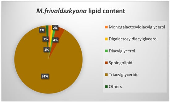 Lipid content of M. frivaldszkyana. Lysophospholipids, lysomonogalactosyldiacylglycerols, lysodigalactosylglycerols, phospholipids, phosphatidylcholine, and phosphatisylethanolamine are given as “Others”, since they represent less than 1% of the total lipid amount.