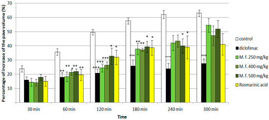 Effects of diclofenac (25 mg/kg bw), M. frivaldszkyana (M. f) methanolic extract in three doses (250 mg/kg bw, 400 mg/kg bw, and 500 mg/kg bw), and rosmarinic acid (30 mg/kg bw) on paw edema induced by carrageenan in rats. * p < 0.05 vs controls at the same hour; ** p < 0.01 vs controls at the same hour; *** p < 0.001 vs controls at the same hour.