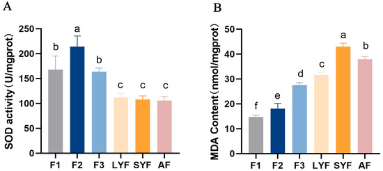 Oxidative stress levels were measured in various follicles. (A) SOD activity. (B) MDA content. The letters above each bar indicate the significance of the differences. Differences with the same letter were not considered significant, while those with different letters were considered significant (p < 0.05). The values in the bars with vertical lines represent the mean ± SEM, which are the same as in the following figures.