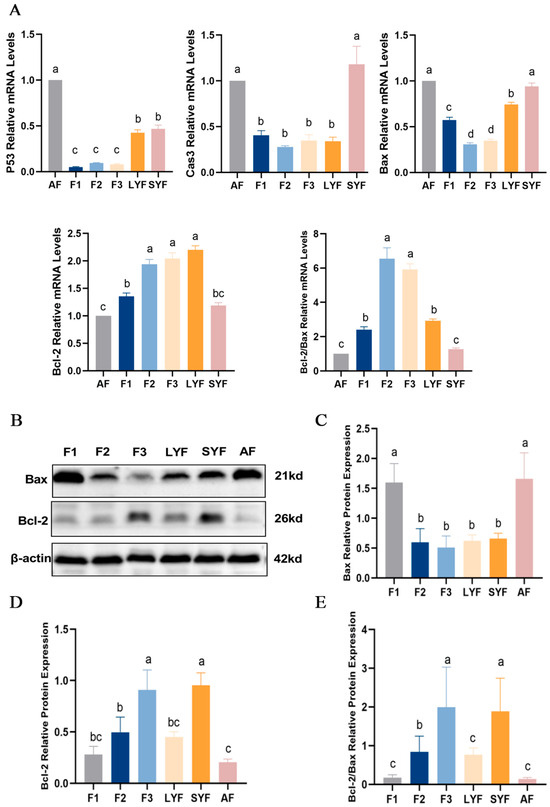 The level of apoptosis in goose follicles at different stages. (A) The mRNA expression of P53, Caspase-3, Bax and Bcl-2. (B–D) The protein expression of Bax and Bcl-2 with β-actin as an internal control. (E) The ratio of Bcl-2 to Bax protein expression. Different letters were considered significant (p < 0.05).