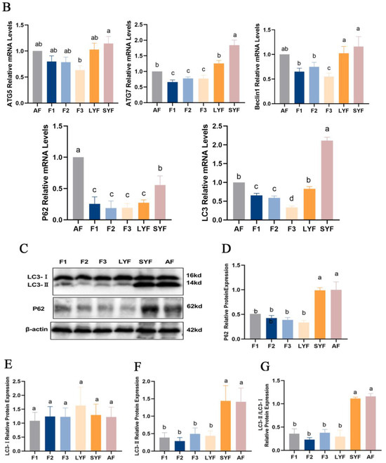 The level of autophagy in goose follicles at different stages. (A) The submicroscopic structure of an atretic follicle. The lysed nucleus is indicated by the red arrowheads, while the cristae-vanishing mitochondria encapsulated by autophagosomes are indicated by the blue arrowheads. The yellow arrowheads indicate cristae-vanishing mitochondria. The scale bars from left to right are 2.0 μm, 500 nm and 1.0 μm, respectively. (B) The mRNA expression of ATG5, ATG7, Beclin 1, P62 and LC3. (C–F) The protein expression of P62, LC3-I and LC3-II normalized to that of β-actin. (G) The ratio of LC3-II to LC3-I protein expression. Different letters were considered significant (p < 0.05).