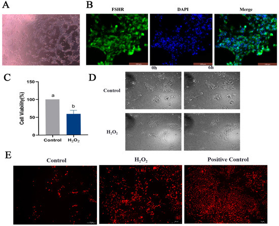 Cultivation and identification of GCs and establishment of an in vitro oxidative stress model. (A) GCs isolated and cultured from goose follicles; GC images are shown under 100× magnification. (B) The expression of the follicle stimulating hormone receptor (FSHR) in GCs determined via immunofluorescence; scale bar = 100 μm. (C) Viability of GCs as examined via CCK8 assay. (D) Observation of morphological changes in GCs using live cell imaging; scale bar = 200 μm. (E) ROS determination using the dihydroethidium (DHE) probe; scale bar = 100 μm. Different letters were considered significant (p < 0.05).