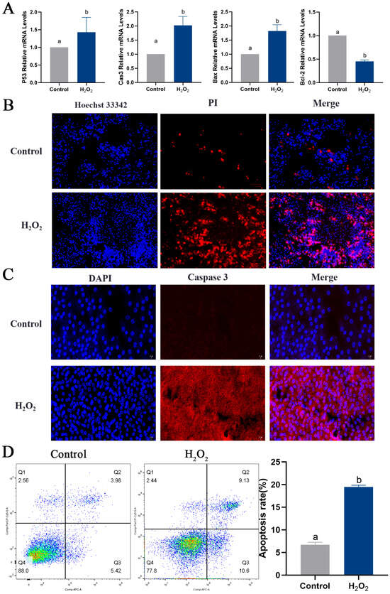 Oxidative stress conditions induce apoptosis and autophagy in GCs. (A) The expression levels of P53, Caspase-3, Bax and Bcl-2 were measured. (B) Apoptosis in GCs determined via Hoechst33342/PI double staining; scale bar = 100 μm. (C) The expression of Caspase-3 protein detected using immunofluorescence; scale bar = 20 μm. (D) Apoptosis rate of GCs determined via flow cytometry. Apoptosis rate (%) = (number of cells in Quadrant 2 + Quadrant 3)/total number of cells × 100%. (E) The expression of ATG5, ATG7, Beclin 1, P62 and LC3. (F) The expression of Beclin 1 protein detected using immunofluorescence; scale bar = 20 μm. Different letters were considered significant (p < 0.05).