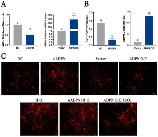 ADPN regulates the production of ROS and influences the generation of ROS induced by H2O2. (A) Expression of ADPN mRNA after siRNA-mediated ADPN knockdown and overexpression plasmid-mediated ADPN overexpression. (B) ADPN secretion in culture supernatants of GCs after ADPN knockdown and overexpression. (C) Effect of ADPN knockdown and overexpression on ROS production in GCs; scale bar = 100 μm. Different letters were considered significant (p < 0.05).