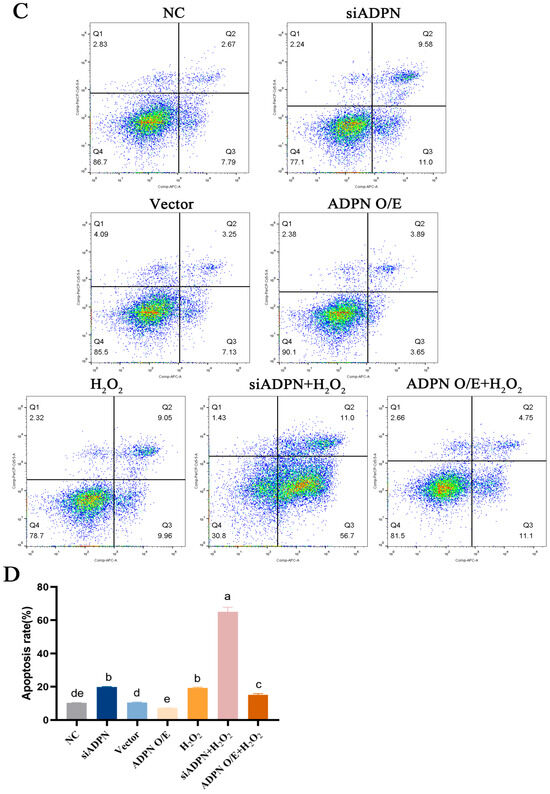 To assess the effect of ADPN on apoptosis and autophagy in GCs under oxidative stress, specific siRNA and overexpression plasmids were used to decrease or increase its expression, respectively. The mRNA expression of ADPN was reduced in GCs transfected with siRNA-ADPN (siADPN) compared to the negative control group (NC), and the mRNA expression of ADPN increased in GCs transfected with the ADPN overexpression plasmid (ADPN O/E) compared to the vector group (Figure 8A). The same trend was observed for ADPN secretion in the culture supernatant of GCs (Figure 8B). The ROS assays results suggested that ADPN has a regulatory effect on oxidative stress in GCs. The knockdown of ADPN resulted in an increase in ROS production, which further enhanced H2O2-induced ROS production. Conversely, the overexpression of ADPN led to a decrease in ROS production (Figure 8C).