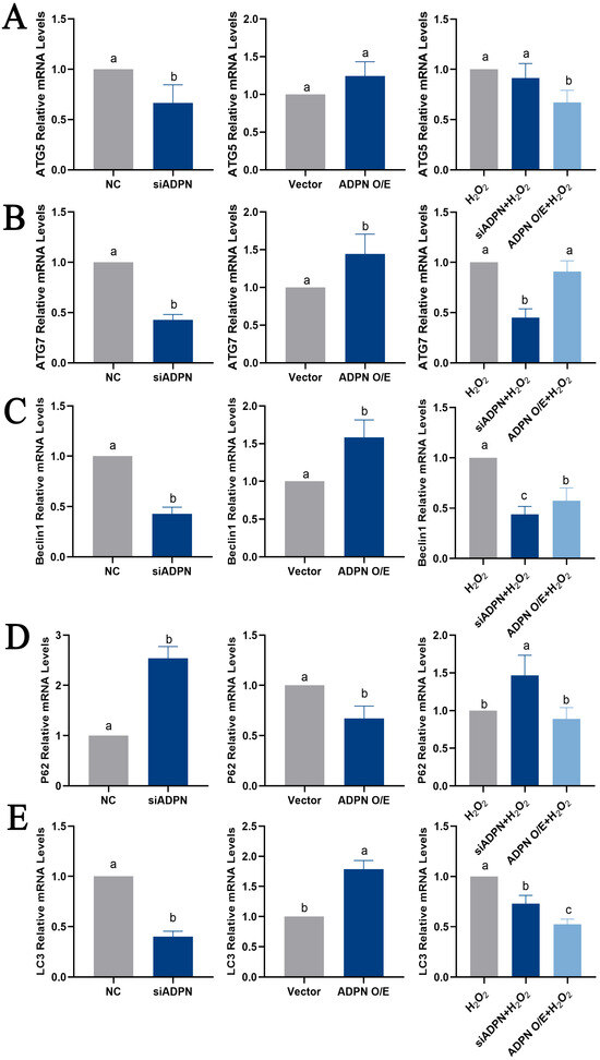 Effects of ADPN knockdown and overexpression on mRNA expression of autophagy-related genes in GCs. (A) RT-qPCR analysis of ATG5 gene expression. (B) RT-qPCR analysis of ATG7 gene expression. (C) RT-qPCR analysis of Beclin 1 gene expression. (D) RT-qPCR analysis of P62 gene expression. (E) RT-qPCR analysis of LC3 gene expression. (F) The expression of Beclin 1 protein detected using immunofluorescence; scale bar = 20 μm. Different letters were considered significant (p < 0.05).