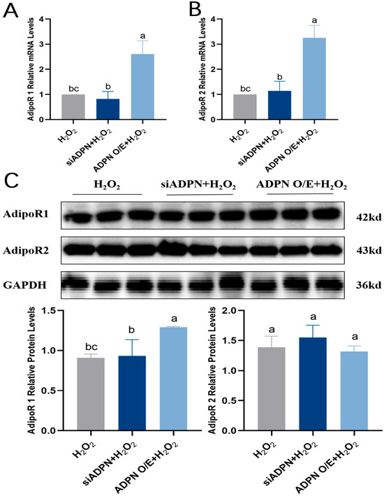 Since the biological effects of ADPN are mediated by its binding to the AdipoR1 and AdipoR2 receptors, the expression levels of AdipoR1 and AdipoR2 were next examined. The results showed that both AdipoR1 and AdipoR2 mRNA expression increased (Figure 12A,B), AdipoR1 protein expression level was significantly elevated, and there was no significant difference in AdipoR2 protein expression level in the ADPN O/E + H2O2 group compared to the H2O2 group (Figure 12C). There was no significant difference in both AdipoR1 and AdipoR2 mRNA and protein expression in the siADPN + H2O2 group compared to the H2O2 group (Figure 12A–C).