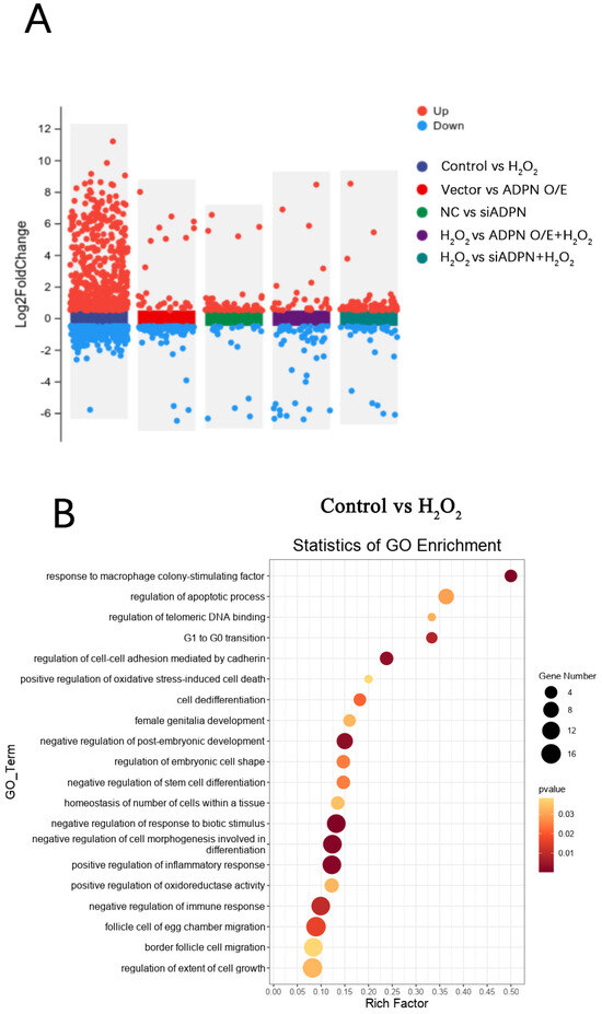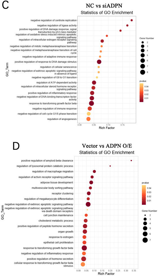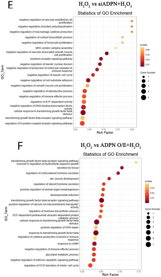 Furthermore, GO analysis of DEGs in the control and H2O2 groups enriched biological processes such as regulation of the apoptotic progress (DEGs: MCL1, FGF10, MAPK7, etc.), cell cycle (DEGs: CAPN3, etc.), positive regulation of oxidative-stress-induced cell death (DEGs: MCL1, etc.), and inflammatory response (DEGs: CTSS, NFκBIA, CCR2, CCR7, etc.), negatively regulating of cell growth (DEGs: SRF, PAK1, MAP3K9, etc.), differentiation (DEGs: ESRRβ, HOXC9, etc.), immune response (DEGs: CRK, ACOD1, ADRA2B, etc.), post-embryonic development (DEGs: APC, SMARCC2, etc.), etc. (Figure 13B). The GO analysis also showed the NC and siADPN groups to be enriched in DEGs negatively regulating the cell cycle (DEGs: PLK2, PCNA, CDKN2B, etc.) and immune response (DEGs: TGFβ3, SAMSN1, etc.) and positively regulating DNA damage (DEGs: FGF10, PCNA, CDKN2B, etc.), inflammatory responses (DEGs: AGTR1, NFκBIA, etc.), apoptosis (DEGs: FGF10, MAPK7, etc.), etc. (Figure 13C). In the Vector and ADPN O/E groups, the DEGs were enriched in biological processes, such as the negative regulation of extrinsic apoptosis (DEGs: FGF10, MAPK7, AGAP2, HMGB2, etc.) and immune response (DEGs: GPX2, MAPK7, etc.), the regulation of hormone secretion (DEGs: GLUL, CASR, etc.), organ growth (DEGs: TENM4, GGCX, etc.) and cell junction maintenance (DEGs: TENM4, F2R, etc.) (Figure 13D). In the H2O2 and siADPN + H2O2 groups, the DEGs were enriched in the negative regulation of the cell cycle (DEGs: HUS1, TTK, etc.), the reproductive process (DEGs: CALR, HUS1, etc.), cell proliferation (DEGs: TGFβ3, MEF2C, etc.) and the immune effector process (DEGs: TGFβ3, DHX58, etc.) (Figure 13E). The ADPN O/E and ADPN O/E + H2O2 groups showed enriched biological processes, such as the regulation of the cell cycle (DEGs: FGF10, PLK2, etc.), hormone secretion (DEGs: AGTR1, NRG1, etc.), response to cAMP (DEGs: COL1A1, AKAP6, PAX4, etc.) and developmental induction (DEGs: FGF10, GDNF, etc.), the negative regulation of apoptosis (DEGs: FGF10, NRG1, GDNF, etc.), the positive regulation of DNA repair (DEGs: FGF10, etc.), etc. (Figure 13F).
