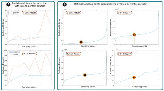 These two approaches were compared using two models, E. coli [24] and CHO [25], to determine the most appropriate strategy to explore the space of feasible flux solutions of a Flux Balance Analysis (FBA). The models were sampled with fixed step lengths up to a total of 16,000 points. Next, the Euclidean distances [26] between the “furthest” and “central” solution were computed as a function of the number of points sampled (Figure 1A). In both cases, the discrete method shows inconsistency between the number of sampling points and the distance between the central and furthest solutions. On the other hand, the continuous method eventually reaches a stable state, meaning that, no matter how many points are sampled, the distance between the furthest and central solution will not tend to vary significantly after a determined number of points. This behavior can be attributed to the dynamic percentile, as it ensures that no outliers are considered.