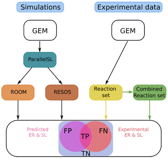 Finally, the reaction set and their combinations corresponding to experimentally measured essential reactions and synthetic lethals, respectively, were compared against the predicted ones (Figure 2). The reaction set comprised a total of 2583 reactions, encompassing all reactions contained in the model. For synthetic lethals, the total considered was 17,159 combinations of the reaction set.