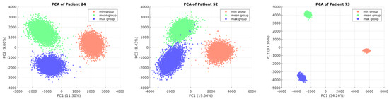 PCA of the minimum, mean, and maximum GEMs. The figure depicts PCAs illustrating the distribution of solutions obtained from three models employed to characterize the metabolic flux profiles of each patient (minimum, mean, and maximum). The plot presents PC1 and PC2 for patients 24, 52, and 73, serving as representative examples of the cohort.