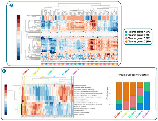To validate these findings, a new clustering analysis was performed, incorporating all patients but focusing solely on the 16 relevant metabolic tasks. This analysis revealed five clusters for columns (patients). Each cluster was then analyzed to determine the contribution of each metabo-group, with values ranging from 0 (no contribution) to 1 (full contribution) (Figure 4B).