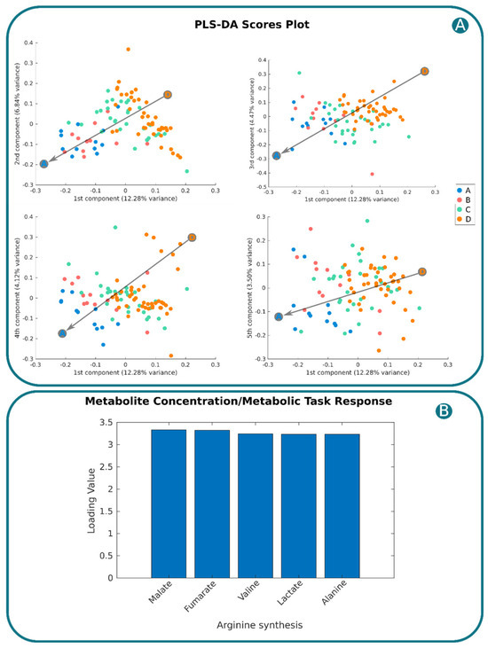 PLSA-DA. (A). Score plot of the PLSDA representing the 95 patients in Component 1 vs. Components 2, 3, 4. and 5. Metabo-groups A, B, C, and D are represented by blue, green, pink, and yellow, respectively. Grey arrow represents trend in the distribution of patients along the first component from group D to group A. (B). Top five task responses to plasma metabolite perturbation from the first 20 components of the PLSDA. Here is represented the loadings corresponding to the sensitivity of arginine synthesis towards perturbations of malate, fumarate, valine, lacatate, and alanine.