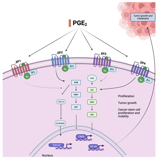 PGE2 is the most important prostaglandin suppressed by NSAID treatment. It is derived from AA (through oxygenation by COX-1 or COX-2 and further modification by a PGE isomerase). Levels of PGE2 are increased in multiple cancer entities and promote carcinogenesis and metastasis in CRC. There are four different subtypes of PGE2 G-protein-coupled receptors: EP1, EP2, EP3, and EP4 [39]. Activation of EP receptors 2 and 4 can upregulate the PI3K/Akt pathway (Figure 1), which is involved in cell proliferation, survival, and differentiation [40]. With activation of the PI3K/Akt pathway, β-catenin translocates into the nucleus, and COX-2 transcription and translation are triggered [41] (Figure 1), resulting in CRC cell migration and metastases [42].