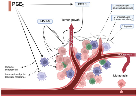 PGE2 impacts angiogenesis in multiple ways. It induces angiopoietin-2 expression, an important vascular growth factor, and impacts immune cell composition. Immunosuppressive macrophages get overexpressed and cause tumor cells to release increased amounts of MMP-9, which degrades collagen IV in the base membrane and the extracellular matrix enabling cancer-cell angiogenesis and metastasis. Angiogenesis allows for further cancer cell mobility and growth. Lower expression of immunostimulatory macrophages additionally hinders an appropriate immune response and restricts checkpoint inhibition therapy. MMP-9 = matrix metalloprotease-9, CXCL1 = CXC motif chemokine ligand 1.