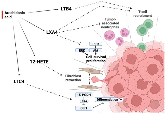 Different LOX-enzymes produce a variety of oxylipins from AA (20:4 n − 6) which exhibit different effects on tumor development. Lipoxin A4 acts in an antitumorigenic manner by downregulating both tumor-associated neutrophils as well as tumor-promoting pathways while promoting T-cell recruitment. This immunostimulatory effect is further supported by leukotriene B4. Leukotriene C4 acts in an antiproliferative manner by promoting cell differentiation through PKA-mediated inhibition of GLI1. 12-HETE, in contrast, promotes tumor development by causing fibroblasts in the tumor-adjacent stroma to retract, opening space for metastasis and tumor growth. LXB4 = lipoxin A4, LTB4 = leukotriene B4, 12-HETE = 12-hydroxyeicosatetraenoic acid, LTC4 = leukotriene C4, PI3K = phosphoinositid-3-Kinase, Akt = protein kinase B, ERK = extracellular-signal-regulated kinases, 15-PGDH = 15-prostaglandin dehydrogenase, PKA = protein kinase A, GLI1 = glioma-associated oncogene.