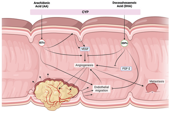 Another DHA-derived lipid mediator important in the context of CRC is CYP P450-derived epoxydocosapentaenoic acids (EDPs). EDPs potently inhibit cancer growth, neovascularization, and metastasis both in vivo and in vitro [61], due to the inhibition of vascular endothelial growth factor (VEGF)- and fibroblast growth factor 2-induced angiogenesis (Figure 4). When combined with a low-dose inhibitor of the soluble epoxide hydrolase (sEH), thereby stabilizing the epoxy compounds, EDPs’ effects were further strengthened, leading to an approximately 70% decrease in tumor growth and metastasis [61]. This is in contrast to the effect of LA (18:2 n − 6)- and AA (20:4 n − 6)-derived epoxy compounds, which showed pro-tumorigenic effects in AOM/DSS-induced colon cancer in mice [62,63]. As depicted in Figure 4, these effects were caused by an increase in local VEGF secretion and receptors coupled with enhanced endothelial migration.