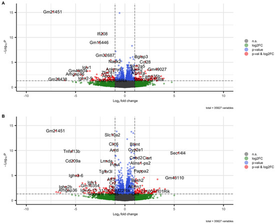 Volcano plots visualizing differentially regulated genes in kidneys 21 days after administration of nephrotoxic serum. (A) BAFF-R KO (B6(Cg)-Tnfrsf13ctm1Mass/J) vs. wildtype (C57BL/6J). (B) BAFF KO (B6.129S2-Tnfsf13btm1Msc/J) vs. wildtype (C57BL/6J) strain.