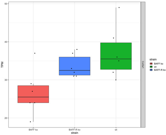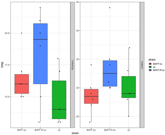 In addition, the TNF superfamily member TWEAK (Tnfsf12) and its receptor (Tnfrsf12a) were expressed in the kidneys of the three mouse strains (Figure 4). Thereby, the expression of TWEAK and its receptor were similar in BAFF ko (Tnfsf12 median: 28.5 TPM, Tnfrsf12a median: 12 TPM), BAFF-R ko (Tnfsf12 median: 32.5 TPM, Tnfrsf12a median: 19.5 TPM) and wildtype kidneys (Tnfsf12 median: 29 TPM, Tnfrsf12a median: 14 TPM). However, the expression of TWEAK was higher compared to the expression level of the receptor in all three strains.
