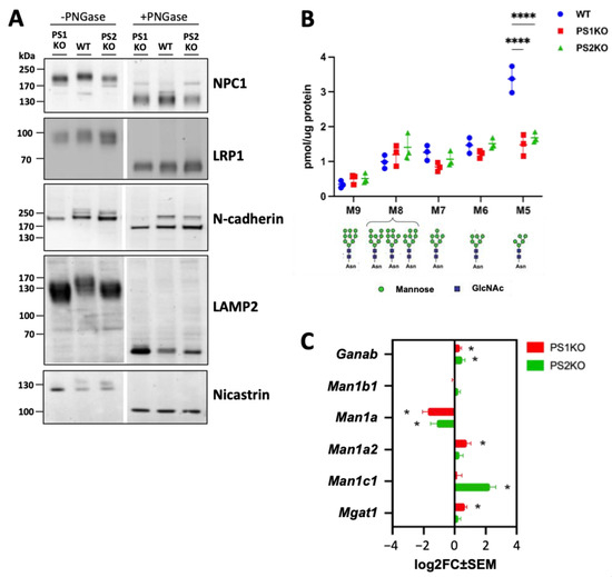 Immunoblot analysis also revealed faster migration of NPC1 and LRP1 in samples from PS1-KO and PS2-KO MEFs (Figure 3A). The effect on mobility of NPC1 was stronger in PS1-KO than in PS2-KO MEFs (Figure 3A). Since these proteins undergo complex N-glycosylation, we tested the sensitivity of these proteins to PNGase F, an enzyme able to remove N-linked oligosaccharides from glycoproteins. We also analyzed the expression of other membrane glycoproteins, including N-cadherin, Lamp2, and Nicastrin. The glycosylation and maturation of Nicastrin were previously shown to be impaired in PS-deficient cells due to impaired assembly and forward transport of the γ-secretase complex [55,56,57,58,59,60]. Notably, a mobility shift was detected not only for NPC1 and LRP1, but also for other examined membrane glycoproteins in PS KO MEFs (Figure 4A). As expected, PNGase F treatment increased the migration of these proteins due to decreased molecular mass upon deglycosylation (Figure 4A). However, PS deficiency had no effect on the migration of deglycosylated proteins. These data strongly indicate that alterations in the molecular mass of these proteins from PSs KO cells are due to altered N-glycosylation. Additionally, it has been suggested that PS deficiency results in a general impairment of the N-glycosylation machinery [61].