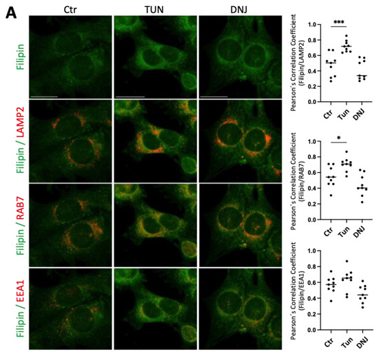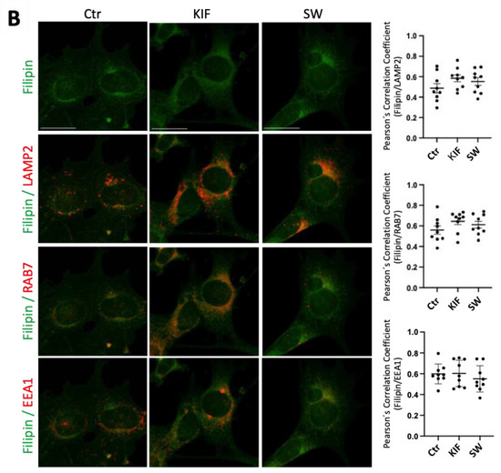 Images were acquired using the Zeiss Axio Vert series Axiovert 200 inverted microscope (RRID: SCR_020915) and ZEN microscopy software, ZEN 3.0 (Zeiss, Oberkochen, Germany) or the VisiScope CSU-W1 spinning disk confocal microscope and VisiView software, version 4 (Visitron System GmbH, Puchheim, Germany). Filipin fluorescence was detected using UV excitation at 350 nm. In Figure 1, detection of TUJ1 and NeuN was obtained using the secondary fluorescent antibodies goat anti-rabbit 546 and goat anti-mouse 488, respectively. An analysis of filipin intensity was performed in TUJ1/NeuN double-positive neurons. In particular, a region of interest (ROI) was manually drawm to select the TUJ1 signal surrounding the NeuN-positive nuclei. The same ROI was then used to measure the intensity in the Filipin channel. Detection of Lamp2 was obtained using the secondary antibody goat anti-rat 546, while for RAB7 and EEA1, goat anti-mouse 488 and goat anti-rabbit 647 were used, respectively. The laser’s power and exposure time settings were maintained constant through the acquisition of experimental group samples and respective controls. For each experimental group, at least six images per coverslip were randomly taken and used for quantification. For all fluorescence microscopy images, acquisition and quantification were performed using 8 bit TIFF images in grey scale. For the presentation of composite pictures, the green and red channels were chosen as pseudo-colors to visualize the staining of interest. Image processing was performed using the free software ImageJ (Version: 2.9.0/1.53t, RRID: SCR_003070).
