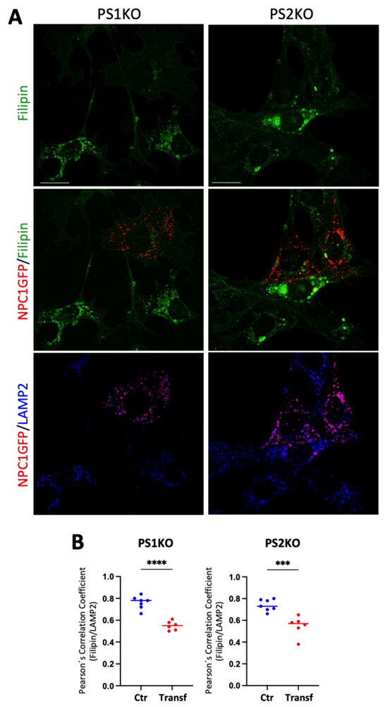 NPC1 overexpression rescues the lysosomal cholesterol accumulation in PS1 and PS2 KO mouse embryonic fibroblasts. (A) Representative immunostaining of filipin (green) with the NPC1-His6-EGFP construct (red) and LAMP2 (blue) in PS1 (PS1KO) and PS2KO (PS2KO) mouse embryonic fibroblasts (MEFs). Scale bar: 20 μm. (B) Colocalization analysis of the filipin signal and LAMP2 in transfected and non-transfected (Ctr) cells. Two coverslips per condition were analyzed from three independent transfections (N = 3). Data points on graphs represent individual quantified cells. The original 8-bit pictures were pseudo colored to better visualize the visualization. Unpaired two-tailed Student’s t test. ***, p < 0.0005; ****, p < 0.0001.