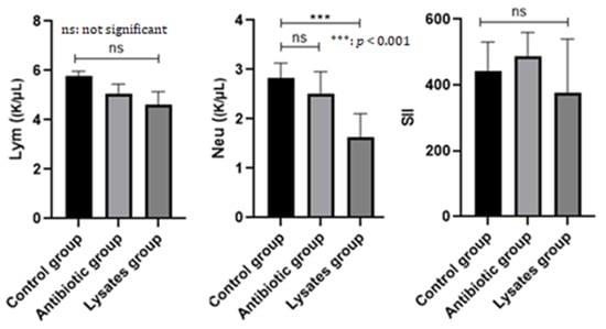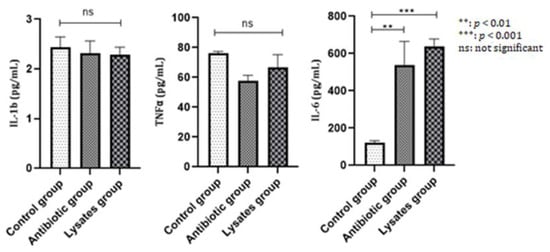 The normal distribution of the data was analyzed using the Shapiro–Wilk test, after which we performed a statistical analysis of the data by applying one-way ANOVA, Bonferroni test with multiple comparisons between the control and antibiotic group, control and bacterial lysate group. The statistical significance level was set at p < 0.05, and GraphPad Prism software (Version 9.4.1, GraphPad Prism Software Inc., La Jolla, CA, USA, released on 26 July 2022) was used.