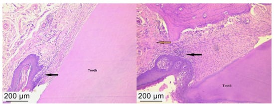 Histological appearance of the periodontal tissues in the control group where inflammatory infiltration can be observed in the periodontal ligament (black arrow) and fibrous tissue (brown arrow). Hematoxylin–eosin staining, ob. 10×.