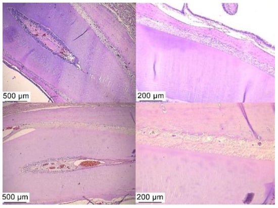 For histopathological examination, the samples collected were fixed in 10% formaldehyde and then decalcified in a decalcifying solution (Histo-Decal, Pantigliate, Italy) for 14 days. After the decalcification period, the samples were processed for paraffin embedding by re-sectioning 5 µm serial sections, followed by staining with hematoxylin–eosin for light microscopic analysis (DM 4000B, Leica, Wetzlar, Germany).