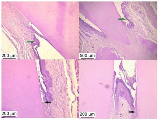 Histological aspect of periodontal tests showing reduced inflammatory infiltrate (black arrow) and periodontal sac free of cellular detritus (green arrow)—group with PD treated with bacterial lysate. Hematoxylin–eosin staining, ob. 4× and 10×.