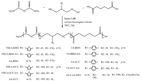 A pool of a total of six monomers, three diacids (adipic acid (AA), 2,5 furandicarboxylic acid (FDCA) and terephthalic acid (TA)) and three diols/polyols (1,4-butandiol (BDO), glycerol (GLY) and erythritol (ERY)) was used in different combinations for the copolymer or terpolymer synthesis. The enzymatic polycondensations were performed either in solvent-less systems or in the presence of organic solvents. The general reaction scheme is presented in Figure 1. Six copolymers and five terpolymers were enzymatically synthesized and fully characterized in terms of the structural and thermal properties. In the case of the copolymers, we exhaustively combined the three diacids with two polyols (BDO and GLY), whereas in the case of terpolymers, we added the more hydrophilic monomer ERY, with the aim being to increase the product solubility, as described below (see Section 3.2).