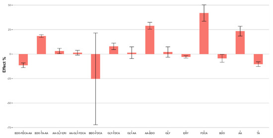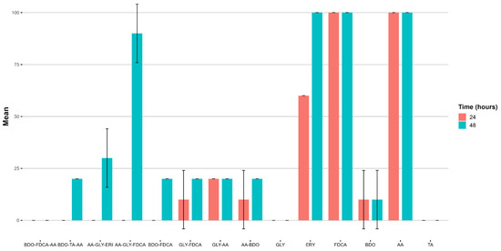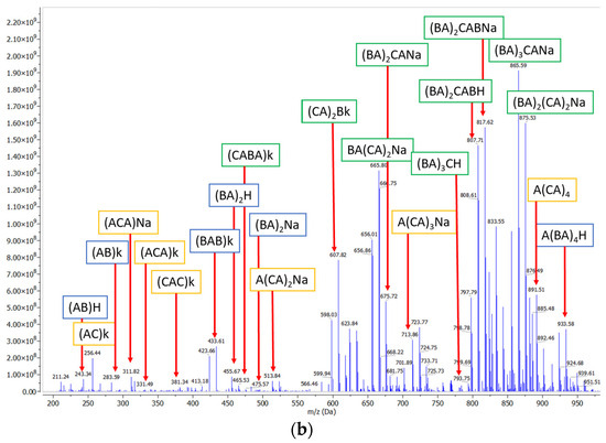 For the ter-oligoesters containing BDO, AA and FDCA (Figure 2b), the peaks with m/z 455, 661 and 875 were assigned to the Na+ adducts of the linear ter-oligoesters (highlighted in green in Figure 2b) constituted by 4–8 monomers. No traces of unreacted monomers were observed in the product mixtures. It must be underlined that the synthesis of the terpolymers led to a product mixture that also included co-oligoesters (BDO-AA in yellow and BDO-FDCA in blue), albeit as a minor component. The ESI-MS spectra corresponding to the other oligoesters are included in the Supplementary Material as Figures S1–S7.