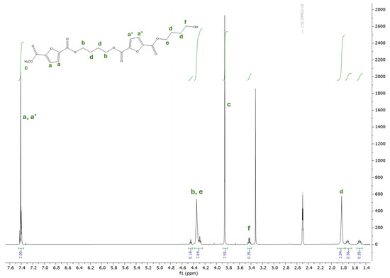 The substrate conversion and the structure of the products were evaluated by NMR analysis. The signal assignments were performed based on the 1D and 2D spectra, while the conversion values were determined based on the 1H-NMR. In the 1H-NMR spectra (Figure 3) of the purified oligo butylene furanoate, the signals from 1.4 ppm were used for the calculation of the BDO conversion, the signals from the interval 3.86–3.84 ppm were used for the DMF conversion, while the ones from 2.35–2.17 ppm, corresponding to adipic acid, were used for the determination of AA conversion.