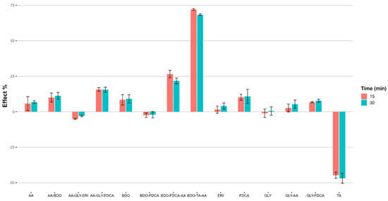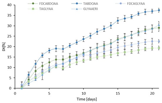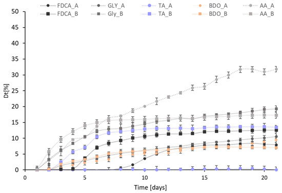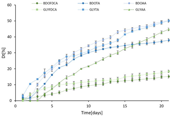 In the case of the co-oligomers, when comparing the Dt21 values (Figure 4), we observed a clear negative effect of the FDCA (likely due to the furanic group) when combined with both GLY and BDO. Along the series of BDO- and GLY-containing copolymers, both products with fully aliphatic (AA) and fully aromatic (TA) moieties are more degradable than FDCA; however, for BDO, we observed the prevalence (in terms of biodegradability) of the aliphatic AA over the aromatic TA, whereas when combined with GLY, we observed a different pattern, with the slight prevalence of the TA over the AA copolymers.