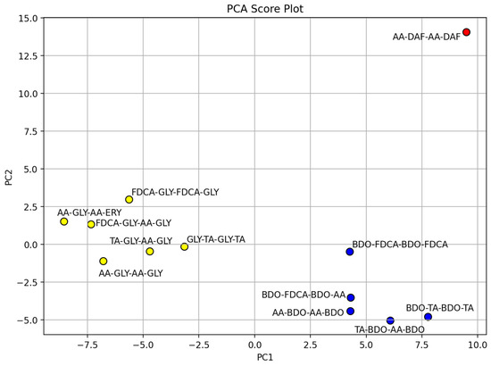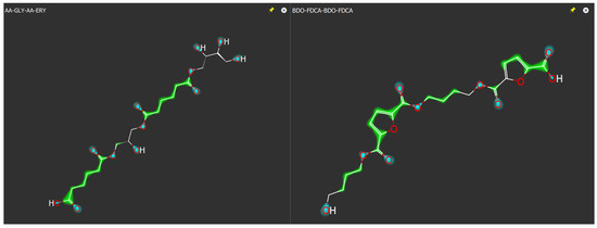 The computational study aimed to numerically describe the different copolymers and terpolymers that can be formed in the enzymatic polycondensation to identify the molecular properties related to biodegradation. Given the intrinsic difference among the two classes (copolymers and terpolymers), we built a set of comparable molecular structures through the use of tetramers by linking diacids and diols, as reported in Table 6. In some cases, both monomers were repeated twice, whereas in other cases, only one monomer was repeated twice and the other was present with two different forms; for example, FDCA-GLY-AA-GLY contains two different diacids whereas AA-GLY-AA-ERY contains two different diols.