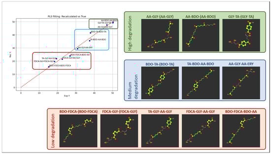 The Partial Least Square (PLS) analysis [57] was used as the regression method, with a dataset of 12 molecules because the outlier identified in the PCA was excluded from the analysis. Despite the low number of objects, positive Q2 values were obtained for dimensionality four and five, and we finally selected a model with five latent variables, which yielded R2 = 0.98 and Q2 = 0.57 (details of the models obtained by varying the number of latent variables are reported in the Supplementary Material). Scatterplots reporting the fitting obtained for the biodegradation values are reported in Figure 9, with the tetramers grouped into three groups by the different degradation values.