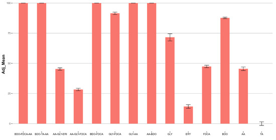 The aliphatic ERY monomer was introduced in this study because of its high polarity and hydrophilicity, which is expected to increase the solubility of the corresponding oligomers. Indeed, data indicate that oligomers are more biodegradable when ERY is introduced in place of the aromatic FDCA or TA. Overall, pairwise analysis of the Dt21 data suggests the less pronounced stability of FDCA-containing products compared to data observed for the co-oligomers. In support of this finding, it must be noted that all five ter-oligomer mixtures considered in this study contain other aliphatic moieties (see Figure 5), which might mask or counterbalance the effect of FDCA. Altogether, the difficulty of establishing the effect of the structural moieties on the stability/biodegradability prompted us to further investigate the data with additional tools, as described in the next section.