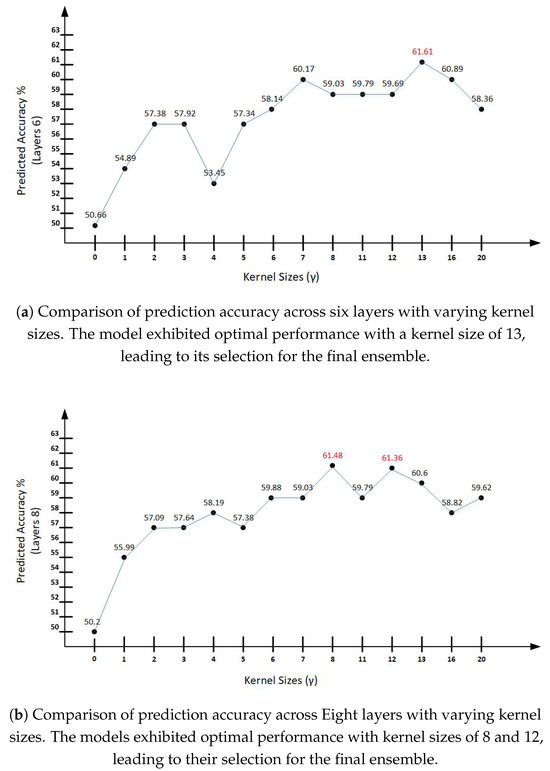 As illustrated in Figure 3, we tried different sizes of kernels, i.e., context layer or semi-context of inputs declared as gamma for hidden layers, i.e., taking inputs by looking at the size of context layers for hidden-to-hidden networks. In this case, the number of inputs by the kernels is . For the proposed model, various sizes are trained, tested, and validated to check the applicability of bigger data sizes and a larger number of classes for better prediction accuracies. We tried a value of 0 to 20 and the prediction accuracies displayed different patterns on different sizes. The prediction accuracies at 8, 12, and 13 are proven to be effective.