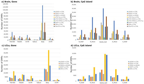 Distribution of the differentially methylated positions (DMPs) found in brain (a,b) and LCL (c,d) comparisons. Bar plot depicting the number of brain DMPs found in each region related to gene (a,c) and CpG islands (b,d). CpGs sites were found in different gene regions: transcription start site (TSS1500 and TSS200), untranslated region (5′UTR and 3′UTR), first exon, and body gene. If we take CpGs islands as reference, CpGs may be found in shores (2 kb from islands) or shelves (5 kb from islands) and may be closer to 5′ end (N) or 3′ end (S). Filters applied: adjusted-p value < 0.05. Abbreviations: CTRL, healthy controls; sEOAD, sporadic early-onset Alzheimer’s disease; PSEN1, autosomal dominant Alzheimer’s disease caused by mutation in PSEN1 gene; MAPT, GRN, and C9orf72, familial frontotemporal dementia caused by mutation in MAPT, GRN, or C9orf72 genes; sFTD-Tau, sporadic frontotemporal dementia with tau deposits; sFTD-TDP43, sporadic frontotemporal dementia with TDP43 deposits; LCLs, lymphoblastoid cell lines.