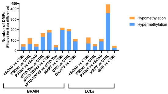 Our findings obtained from FTD patients also revealed hypermethylation to be the most common observation in brain samples. To the best of our knowledge, there are no previous reports analyzing the whole-genome methylation statuses of FTD patients, either in brain tissue or in LCLs. Previous studies using brain samples have specifically investigated the methylation statuses of genes implicated in FTD, particularly C9orf72 and GRN. Other studies have employed whole-blood samples obtained from sporadic FTD patients, but a consensus regarding the predominance of hyper- or hypomethylation compared to controls has not been reached. Some studies have reported increased methylation in FTD patients compared to controls [], while others have found hypomethylation to be more prevalent in patients [].
