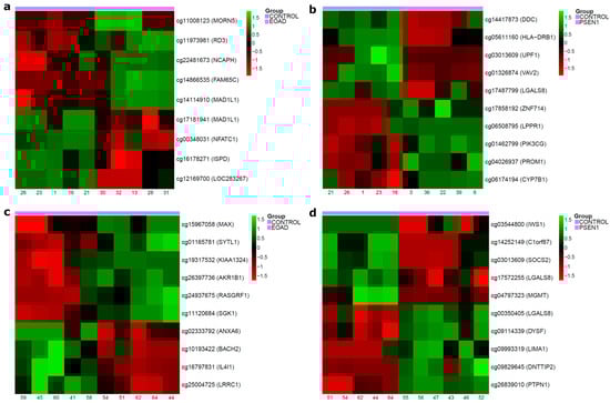 Heatmaps with the top 10 differentially methylated positions (DMPs) in each AD comparison performed. For each CpG, the associated gene is given in parentheses. (a) Brain sEOAD vs. CTRL; (b) brain PSEN1 vs. CTRL; (c) LCL sEOAD vs. CTRL; (d) LCL PSEN1 vs. CTRL. Abbreviations: CTRL, healthy controls; EOAD, sporadic early-onset Alzheimer’s disease; PSEN1, autosomal dominant Alzheimer’s disease caused by mutation in PSEN1 gene; LCLs, lymphoblastoid cell lines.