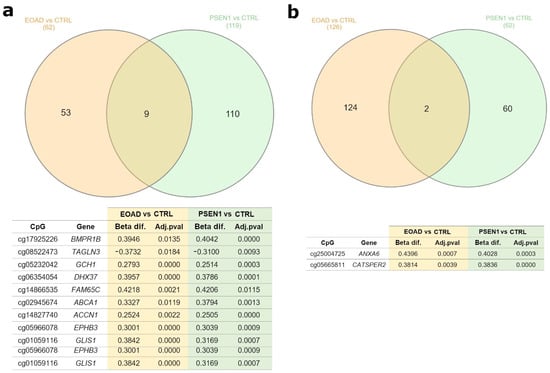 Common differentially methylated CpGs (DMPs) found in different AD comparisons. Venn diagrams showing common DMPs in brain (a) and LCL comparisons (b). Underneath each Venn diagram, a table shows the common DMPs found and their corresponding gene, Beta difference (Beta dif.), and adjusted-p value (Adj.pval). Filters applied: in brain, adjusted-p value < 0.05 and absolute value of Beta difference > 0.25; in LCLs, adjusted-p value < 0.01 and absolute value of Beta difference > 0.35. Abbreviations: CTRL, healthy controls; sEOAD, sporadic early-onset Alzheimer’s disease; PSEN1, autosomal dominant Alzheimer’s disease caused by mutation in PSEN1 gene; LCLs, lymphoblastoid cell lines.